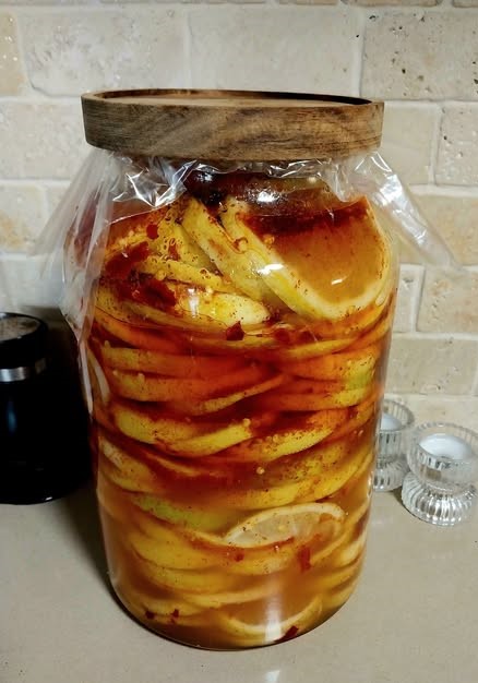 לוקחים לימונים סוחטים ושופכים מעל הכול בערך חצי מכמות הצנצנת תהיה מלאה במיץ,אח"כ