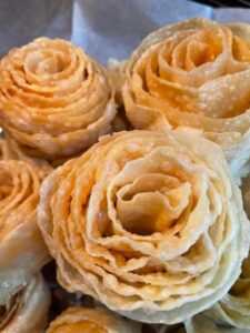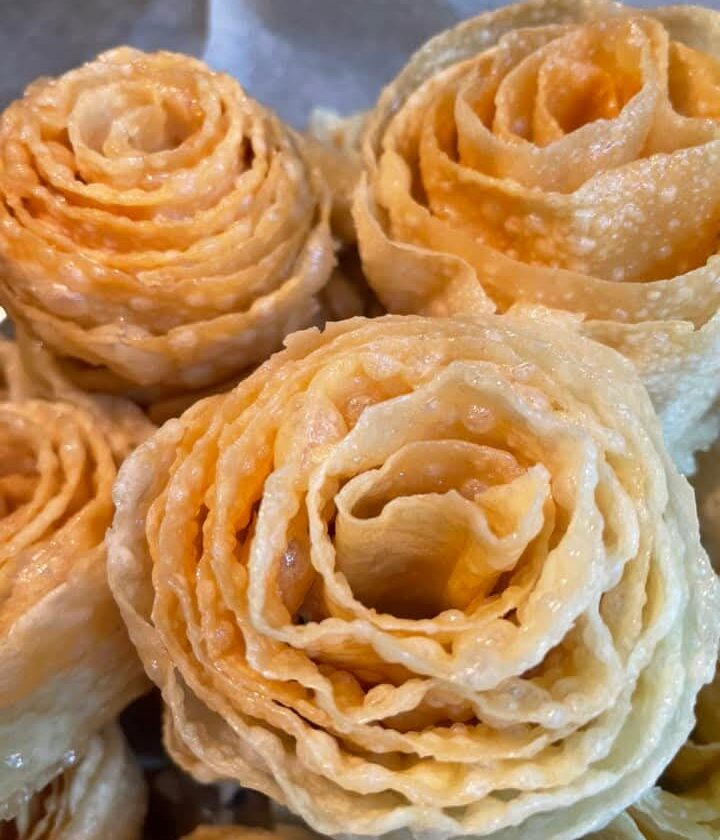 מחממים שמן עמוק במחבת שטוחה. משתמשים במזלג או במקל טיגון ייעודי: תופסים את קצה הרצועה במזלג, מכניסים לשמן ומתחילים לגלגל תוך כדי טיגון ליצירת צורת השושנה המפורסמת. מטגנים עד להזהבה יפה מכל הצדדים. מוציאים למסננת לצינון קל.