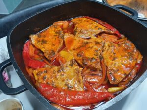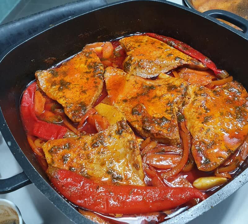 מנה עשירה בירקות, עם רוטב אדום עמוק ודגים שסופגים את כל הטעמים.